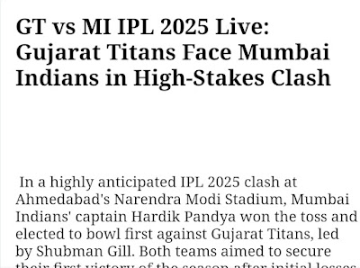 In a highly anticipated IPL 2025 clash at Ahmedabad's Narendra Modi Stadium, Mumbai Indians' captain Hardik Pandya won the toss and elected to bowl first against Gujarat Titans, led by Shubman Gill. Both teams aimed to secure their first victory of the season after initial losses to Punjab Kings and Chennai Super Kings, respectively.